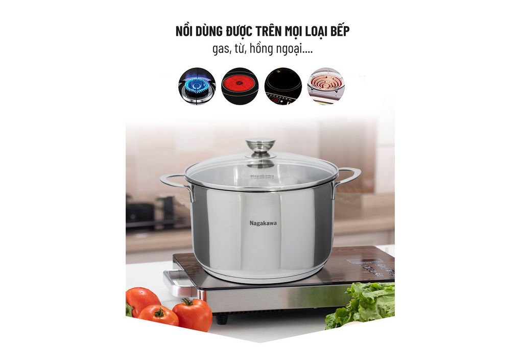 Bộ nồi inox Nagakawa NAG1351 có đáy từ dùng được trên mọi loại bếp. Ngoài việc sử dụng trên bếp gas và bếp hồng ngoại, nồi sử dụng tốt trên bếp từ, bạn có thể thoả sức chế biến nhiều món ăn khác nhau theo cách riêng.