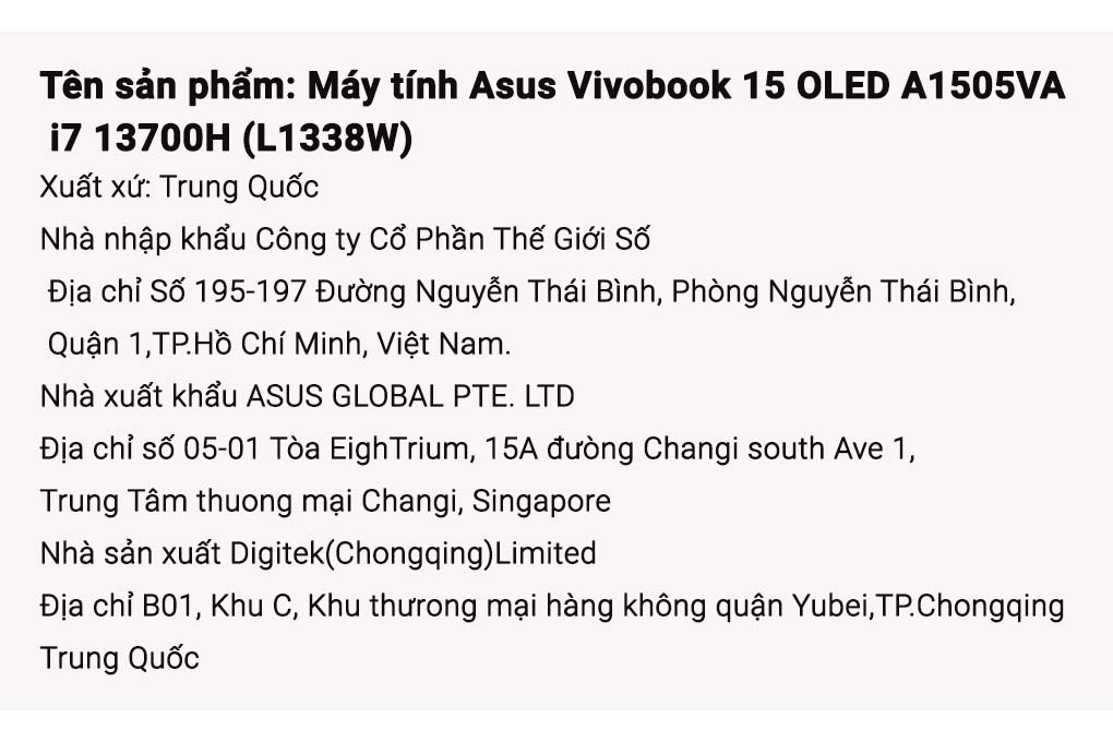 Thông số kỹ thuật Laptop Asus Vivobook 15 OLED A1505VA i5 13500H/8GB/512GB/Win11 (L1052W)