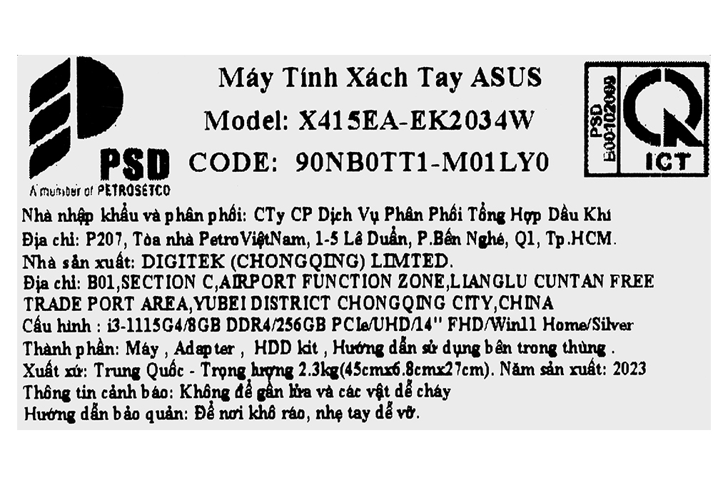 Thông số kỹ thuật Laptop Asus Vivobook X415EA i3 1115G4/8GB/256GB/Win11 (EK2034W)