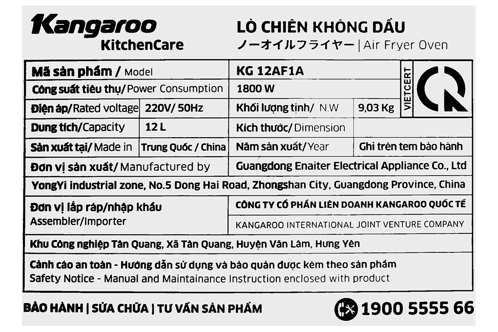 Thông số kỹ thuật Lò chiên không dầu Kangaroo KG12AF1A 12 lít