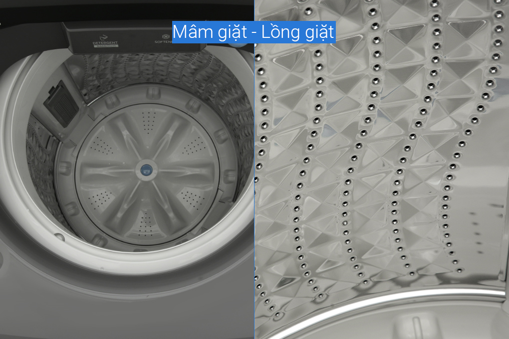 - Lồng giặt được làm bằng thép không gỉ, có độ sáng bóng cao và hạn chế tình trạng gỉ sét, nhờ đó góp phần nâng cao hiệu quả giặt sạch đáng kể cho quần áo.