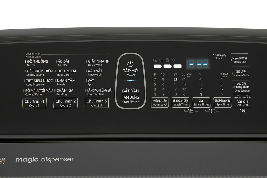 Sản phẩm được tích hợp bảng điều khiển song ngữ Anh - Việt có nút nhấn, màn hình hiển thị giúp người dùng dễ sử dụng và lựa chọn được chương trình giặt phù hợp.