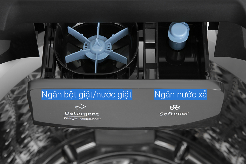 Hộp đánh tan bột giặt có cánh quạt xoay tạo ra dòng nước xoáy mạnh mẽ hòa tan bột giặt, như vậy sẽ hạn chế được cặn của bột giặt lưu lại trên quần áo.