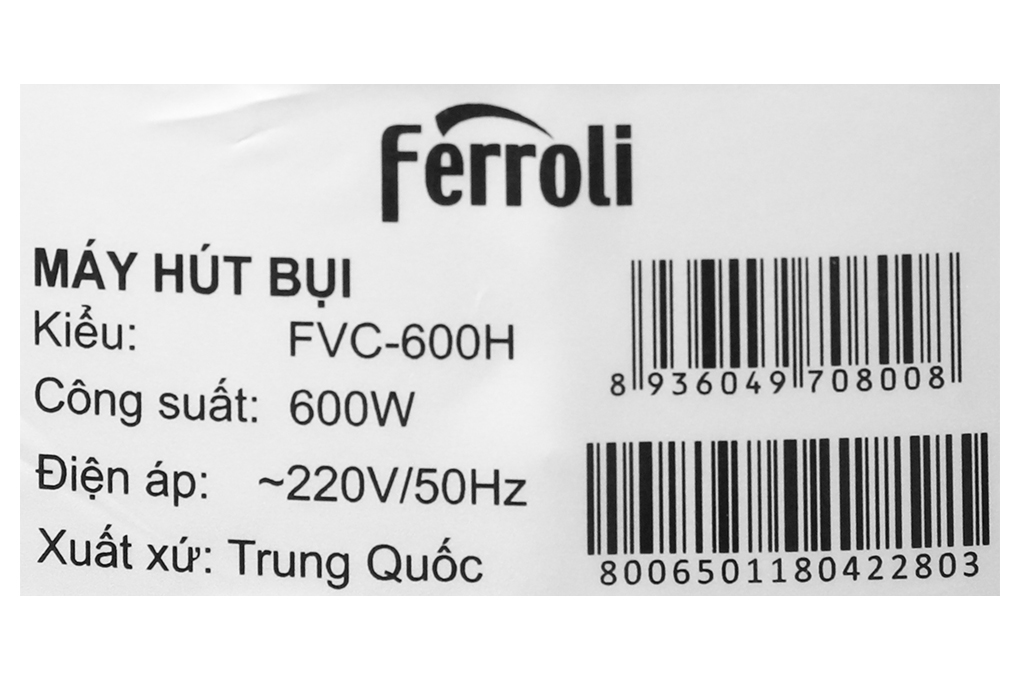 Thông số kỹ thuật Máy hút bụi cầm tay Ferroli FVC-600H