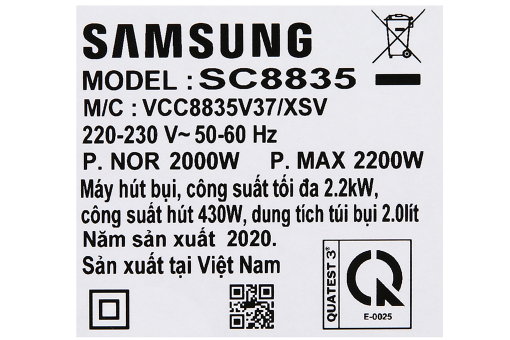 Thông số kỹ thuật Máy hút bụi dạng hộp Samsung VCC8835V37/XSV