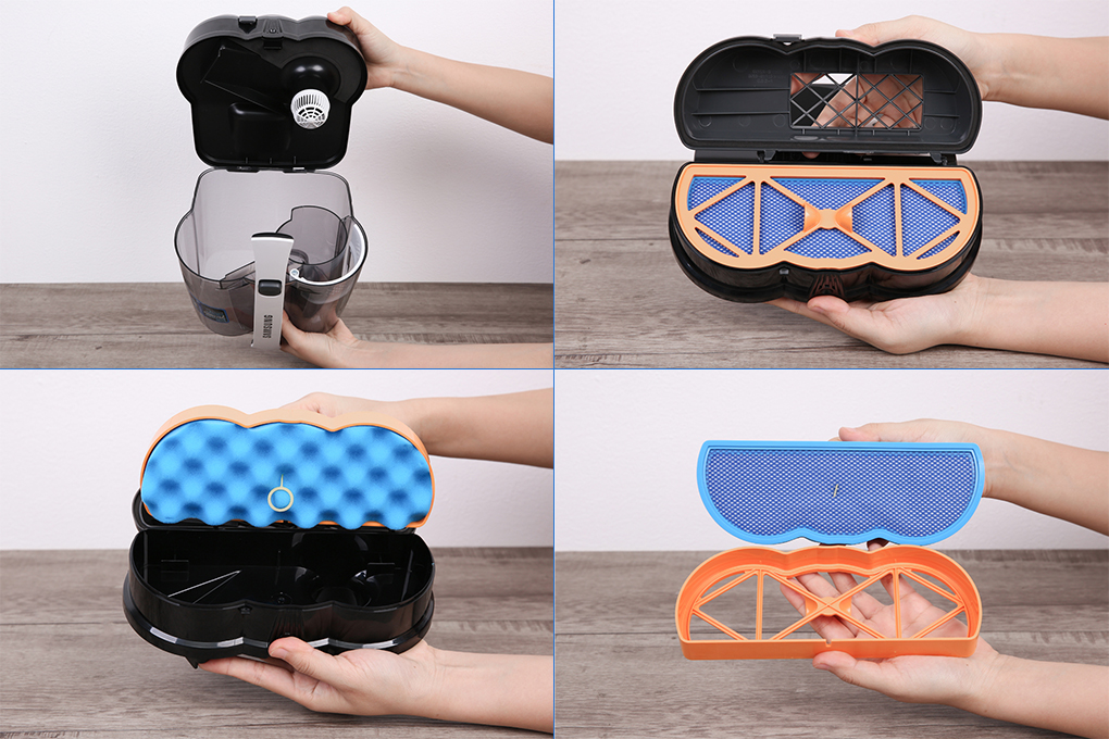 Sản phẩm được thiết kế bình chứa bụi lớn, dễ tháo lắp để vệ sinh. Có thể tái sử dụng mà không cần phải thay thế như túi đựng bụi.