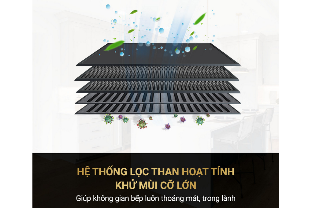 Hệ thống lọc than hoạt tính cao cấp Nagakawa tạo cơ chế trao đổi khí mạnh mẽ, hấp thu cặn bẩn, khói bếp,... đồng thời khử mùi hoàn toàn theo tiêu chuẩn của máy lọc không khí, giúp không gian bếp luôn thoáng mát, trong lành để mỗi phút giây của gia đình bạn trong bếp đều thư thái, dễ chịu.