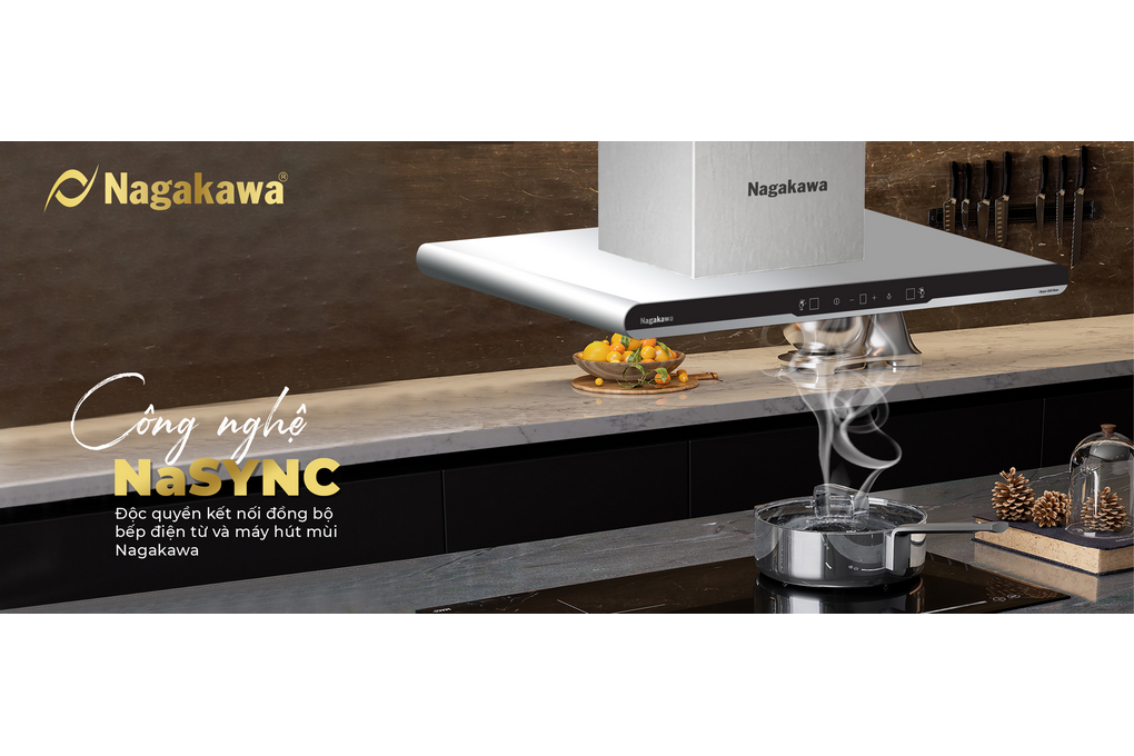 Tích hợp công nghệ NaSYNC - Công nghệ kết nối đồng bộ máy hút mùi và bếp từ độc quyền của Nagakawa, giúp tự động cảm biến bật tắt máy hút mùi rất tiện dụng, tối giản thao tác, tiết kiệm thời gian.