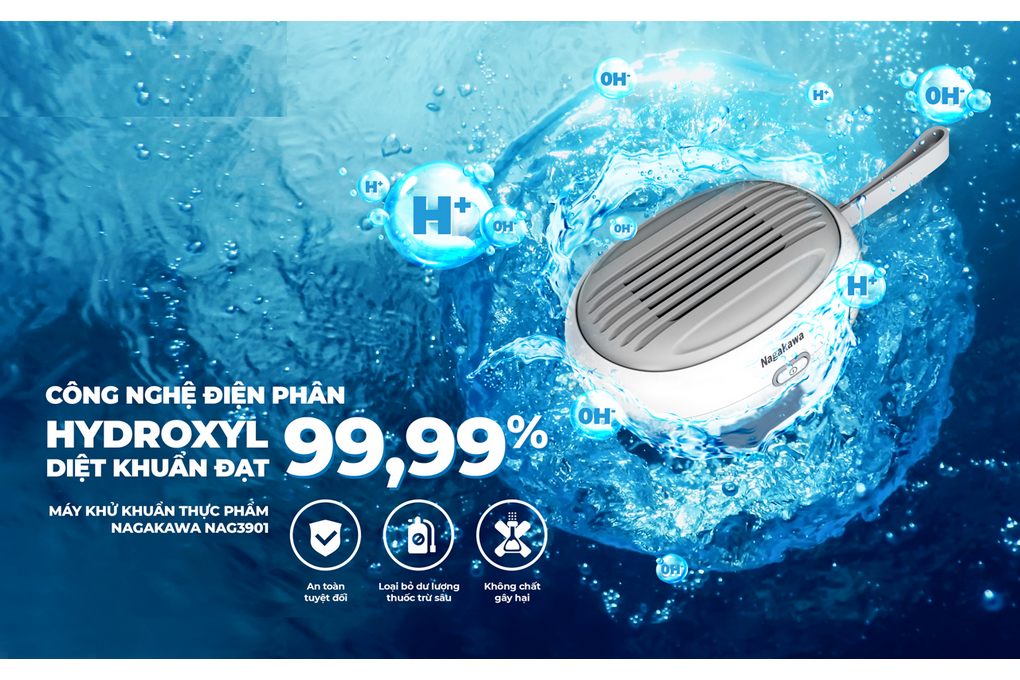 Máy khử khuẩn thực phẩm Nagakawa NAG3901 với công nghệ điện phân Hydroxyl đạt tỷ lệ diệt khuẩn đạt 99,99%, giúp loại bỏ đến 74% dư lượng thuốc trừ sâu, chất bảo quản thực phẩm,... Sản phẩm là kết tinh của công nghệ cao với cơ chế hoạt động khử khuẩn và loại bỏ các chất có hại, vi khuẩn ngay trên thực phẩm bằng công nghệ Hydroxyl, sử dụng nước làm nguyên liệu thô, không cần thêm bất kỳ hóa chất nào.