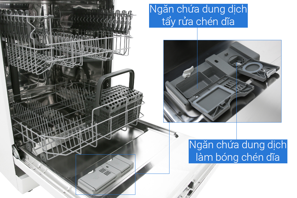 - Máy rửa chén này được thiết kế với 2 khay rửa: khay trên, khay dưới và giỏ dựng dao muỗng đũa.