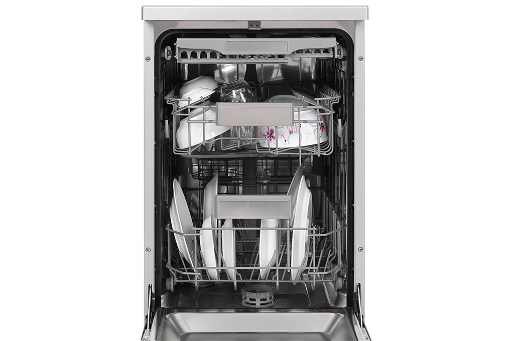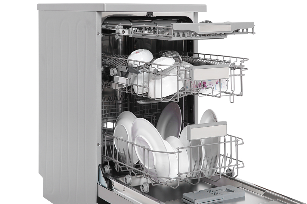 - Máy rửa chén có 3 khay rửa bao gồm: khay để chén đĩa trên, khay để chén đĩa dưới và khay đựng dao kéo.