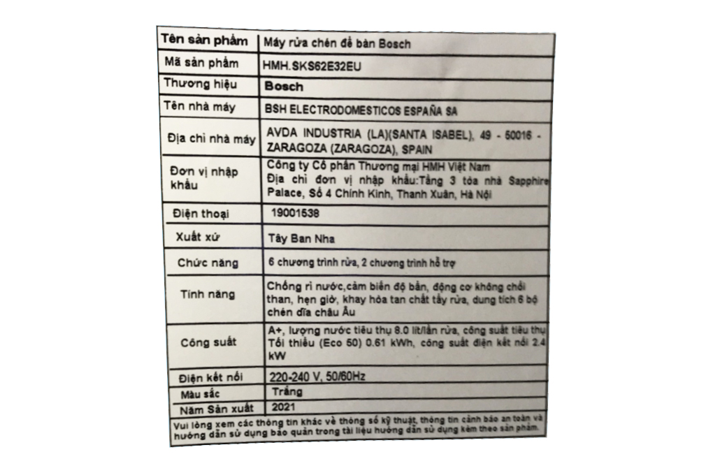 Thông số kỹ thuật Máy rửa chén mini Bosch SKS62E32EU